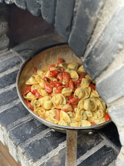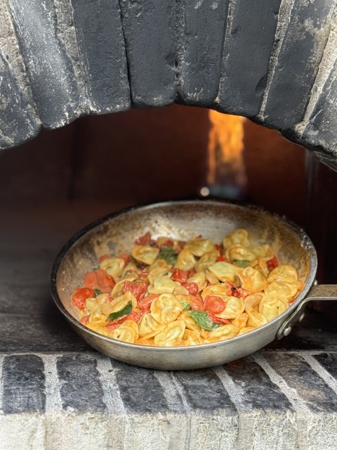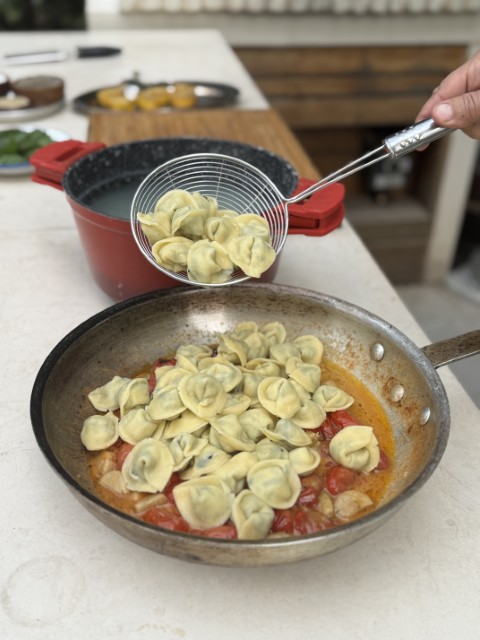 - טורטליני עבודת יד במילוי ריקוטה ופרמזן ברוטב חמאת עגבניות שרי צלויות בטאבון