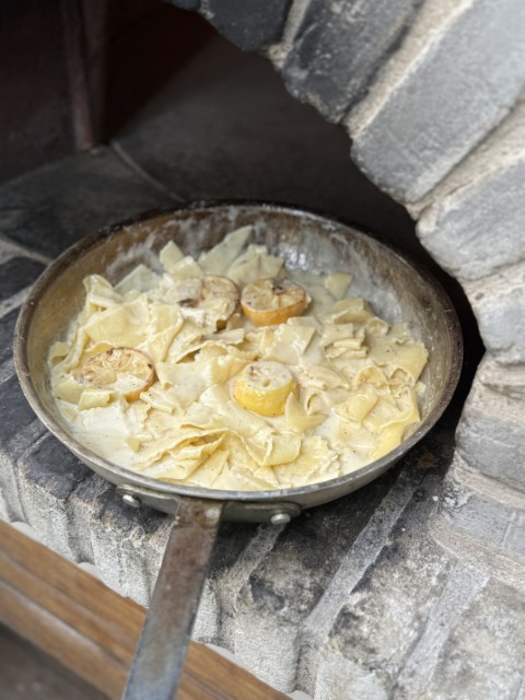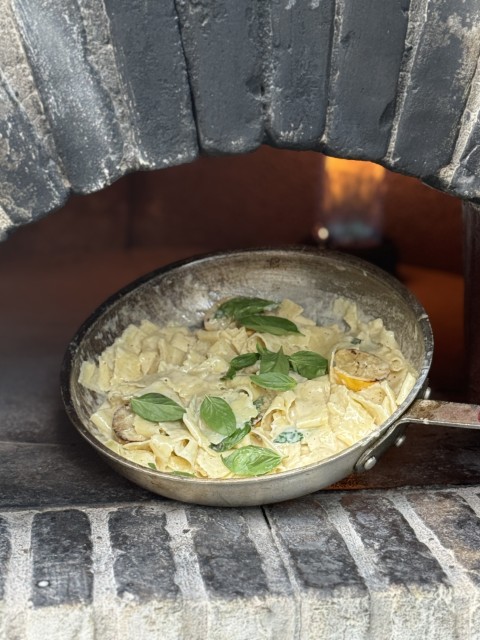 - פסטה טרייה בעבודת יד ברוטב חמאת לימונים צרובים בטאבון, שמנת, פלפל שחור, עלי בזיליקום ופרמז'ן