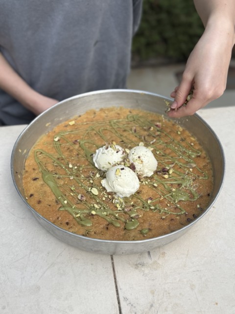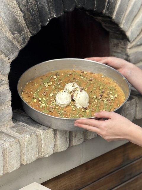 - קינוח: מאפה שוקולד ופיסטוק חם מהטאבון עם גלידת וניל