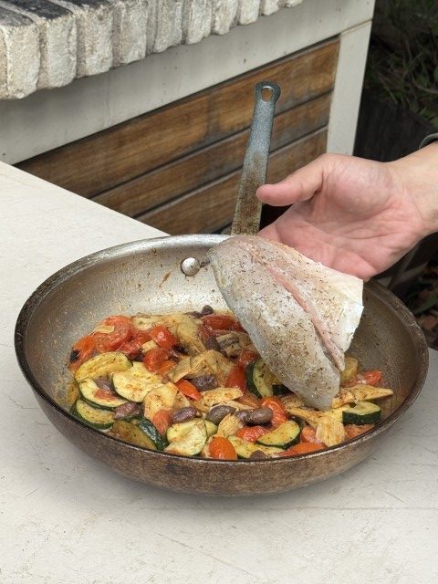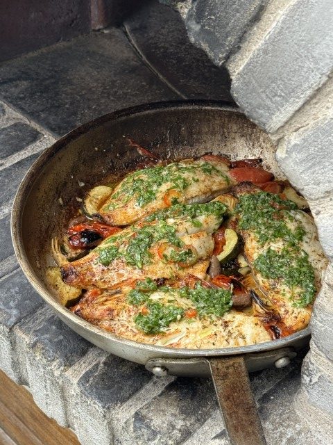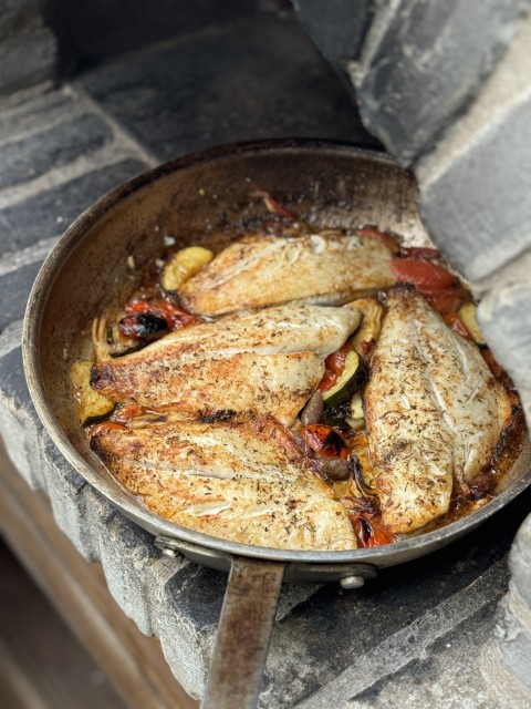 - דניס צלוי בטאבון בחמאת עגבניות, ארטישוק אלה רומנה וזיתים
