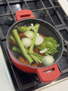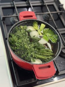 • מכינים ציר ירקות: שמים בסיר מים, סלרי, גזר, בצל , פטרוזיליה ובוקה גרני, מבאים לרתיחה, מנמיכים את האש ומבשלים כחצי שעה עד לריכוך הירקות