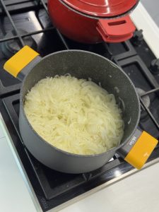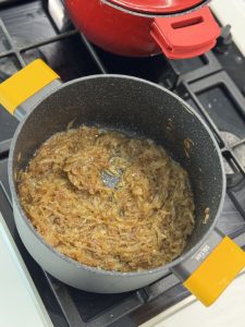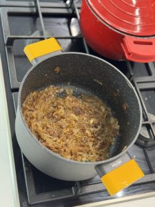 • במקביל מחממים סיר רחב מאוד, שמים שמן וחמאה(אופציונלי) ומוסיפים את הבצל, מטגנים עד להשחמה כחצי שעה.