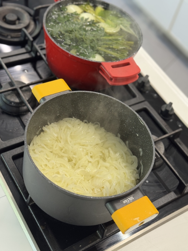 • מסננים את הציר מהירקות והבוקה גרני ומוסיפים את הבצלים לסיר