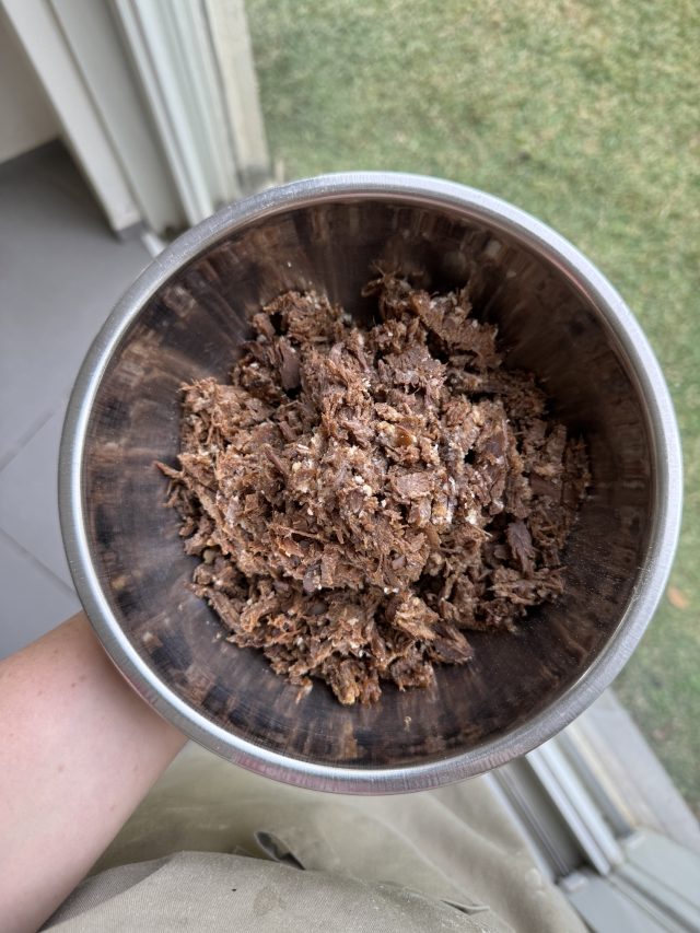 בסיום הצלייה מוציאים את הסוטאז' מהתנור ומפוררים בעזרת שני מזלגות את הבשר לשערות, מצננים היטב, קוצצים את הבשר עם סכין בשביל המלית
