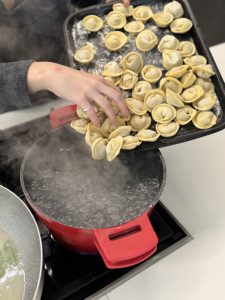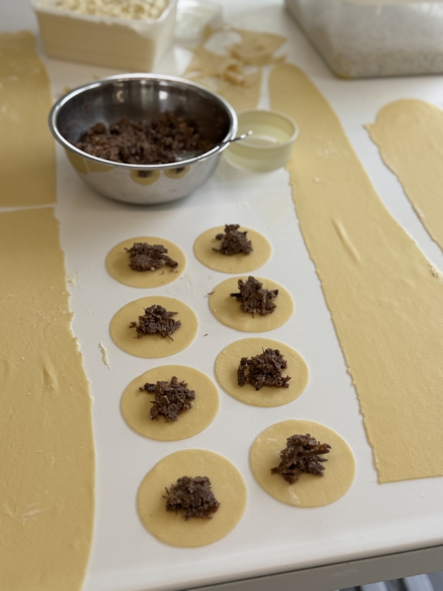 מכינים את הטורטליני: קורצים את בצק הפסטה לעיגולים בקוטר 7 ס"מ , שמים כפית מהמלית במרכז, מרטיבים ממש מעט את דפנות הטורטליני עם מים ומקפלים לחצי, מהדקים סביב המילוי, תופסים את הפינות, מהדקים אותן אחת על השנייה עד ליצירת הטורטליני – מצורף סרטון הדגמה