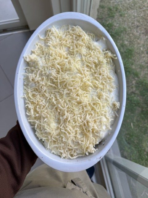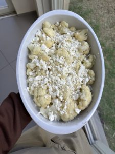 נפורר מעל פרחי הכרובית את גבינת הפטה, נשפוך מעל את רוטב הבשמל, נפזר את הגבינה הצהובה, נכסה בנייר אפיה רטוב מעט ומעליו נייר כסף ונכניס לתנור שחומם מראש לחום של 200 מעלות